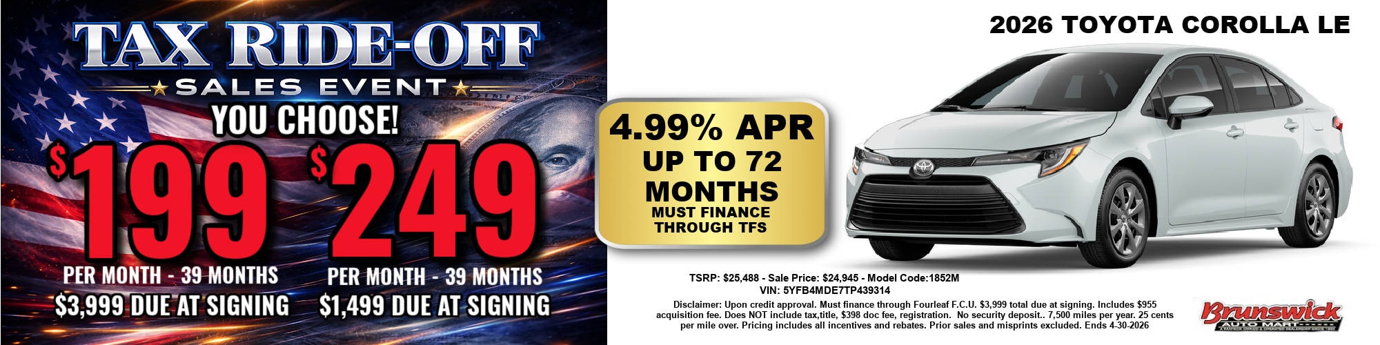 2026 Toyota Corolla LE Lease Special: $199/month for 39 months with $3,999 due at signing!