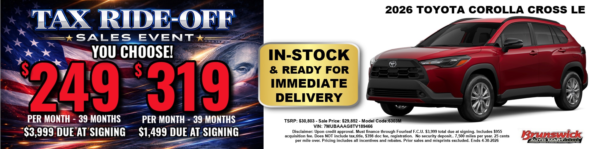 2026 Toyota Corolla Cross LE Lease Special: $249/month for 39 months with $3,999 due at signing!